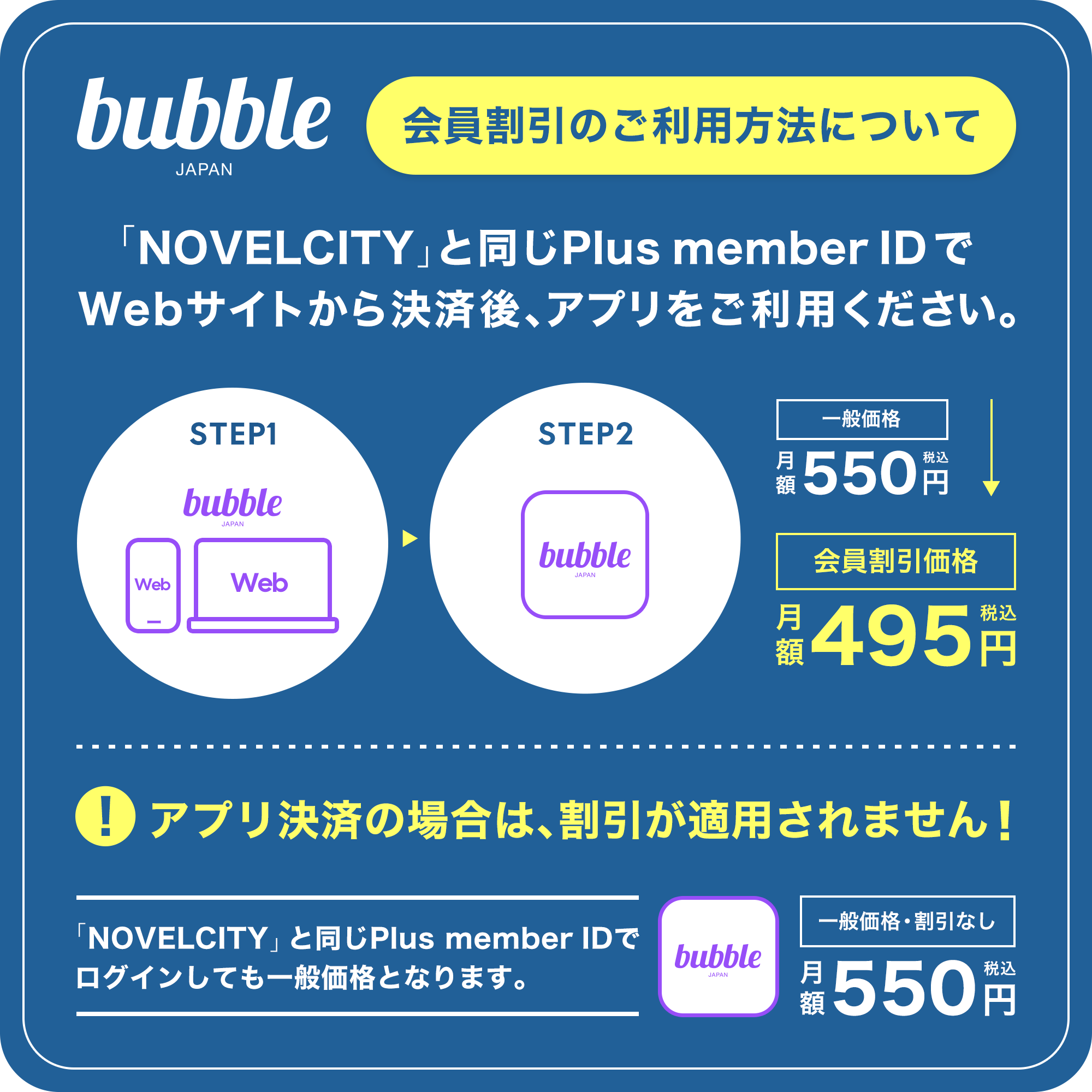 必ずNOVELCITYに会員登録をしているPlus member IDで「bubble for JAPAN」Webサイトよりお手続きください。